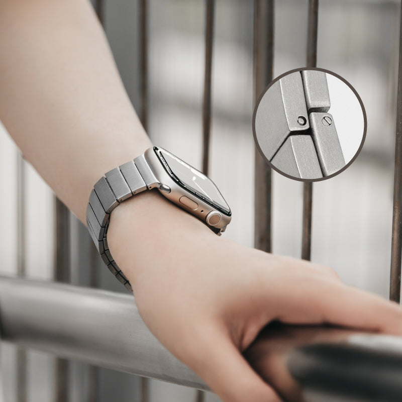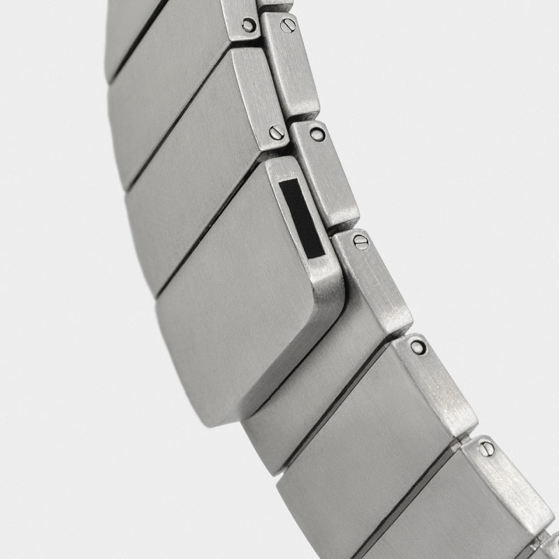 Maestro M 採用304不鏽鋼精製而成,堅固且耐用。錶面拋光呈現髮絲紋,具有現代風格,並透過鏈接的方式設計,展現卓越性與優雅的格調,更創造鏈式錶帶的創新。磁吸式錶扣提供更簡單的穿戴選擇,安全可靠,服貼舒適。