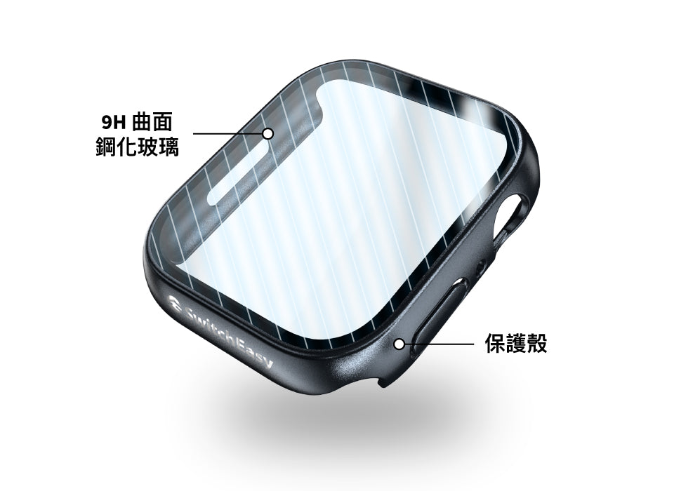 Hybrid 保護殼提供 Apple Watch 二合ㄧ的保護力,將保護殼結合9H鋼化玻璃膜的結構,全面保護你的手錶。