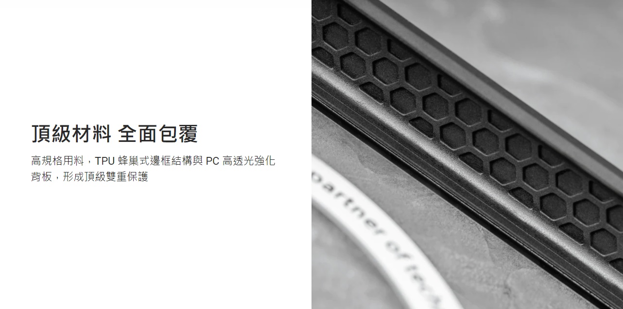 - 高透強化背板、蜂巢式軟邊框結構,提供雙層保護