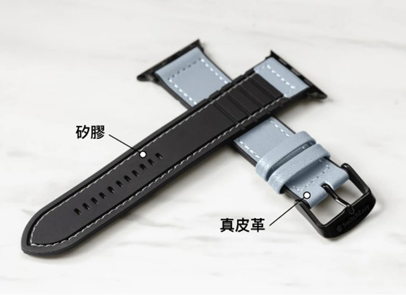 Hybrid 錶帶為硅膠及頭層牛皮縫製而成,呈現細緻的紋理與完美的縫線,襯托Apple Watch 的質感與科技。外層嚴選真皮革保持內斂色澤,內層選用柔韌硅膠材質,不怕汗水,柔軟舒適。316不銹鋼錶扣,讓妳/妳穿戴使用更放鬆,不怕刮傷,不掉漆。